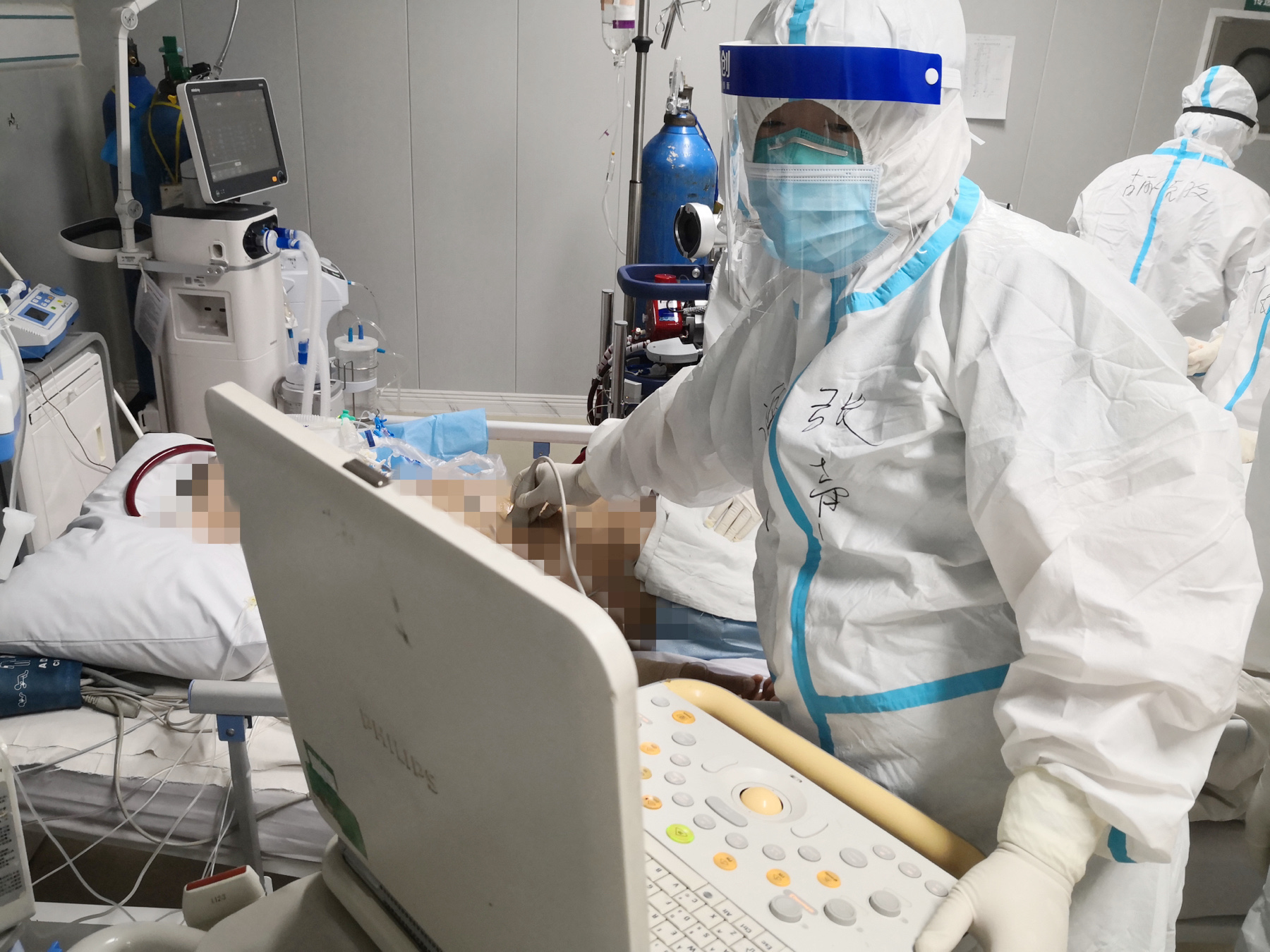 行李刚放下,张声就穿上防护服进了病房,为病人穿刺插管。大热天的病房里没有空调,他又穿着厚厚的防护服在工作,很快全身衣服就被汗湿,头上戴着的防护镜也起雾了。