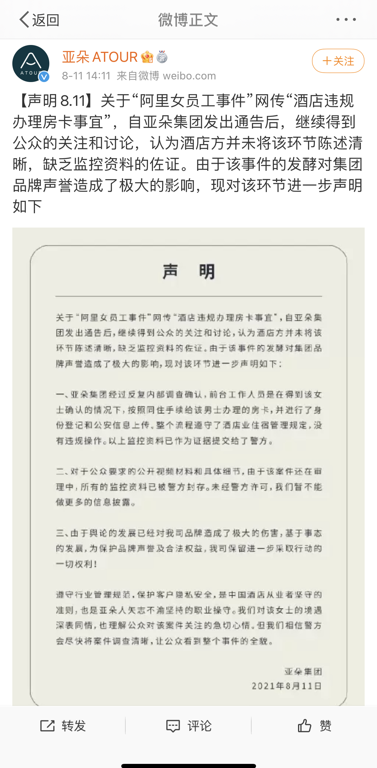 (亚朵酒店官方微博再次发声明截图)