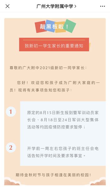 广州大学附属中学表示,原定的8月15日新初一学生报到暨军训动员家长会、8月18日至24日军训大型集体活动等均因疫情防控要求暂停。