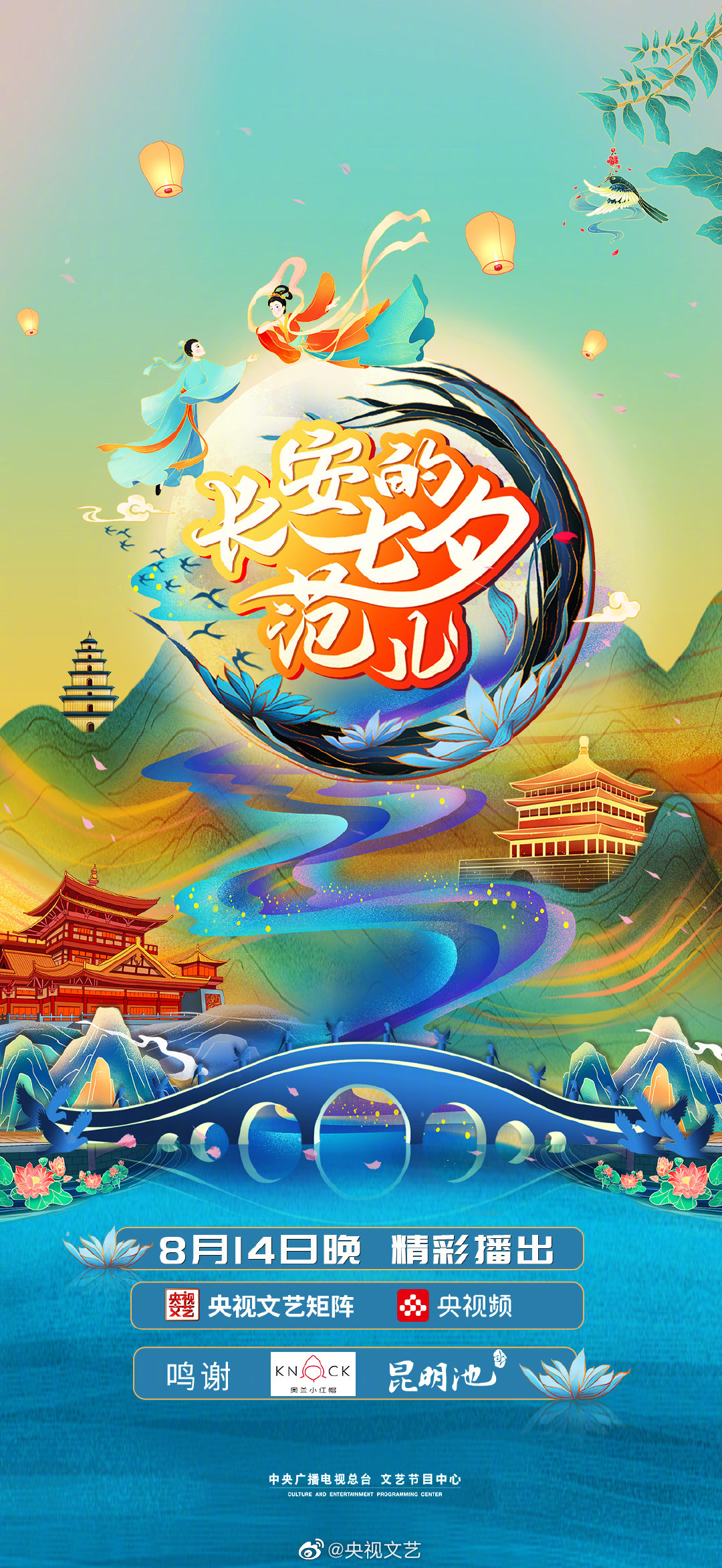 今年央视七夕晚会来到昆明池七夕公园,以“爱·自有光”为主题,以“爱藏眸光流转间”“爱自时光翩跹起”“爱在百年荣光里”三个篇章为主线,在极具浪漫色彩的古韵与美景中,通过歌曲、舞蹈、音乐剧、情景表演、跨屏联动等形式,与观众一起探寻恋人之间纯真的爱、传统文化脉络中真挚的爱、家国百年荣光中炽热的爱,唱响关于“爱”的多元舞台!