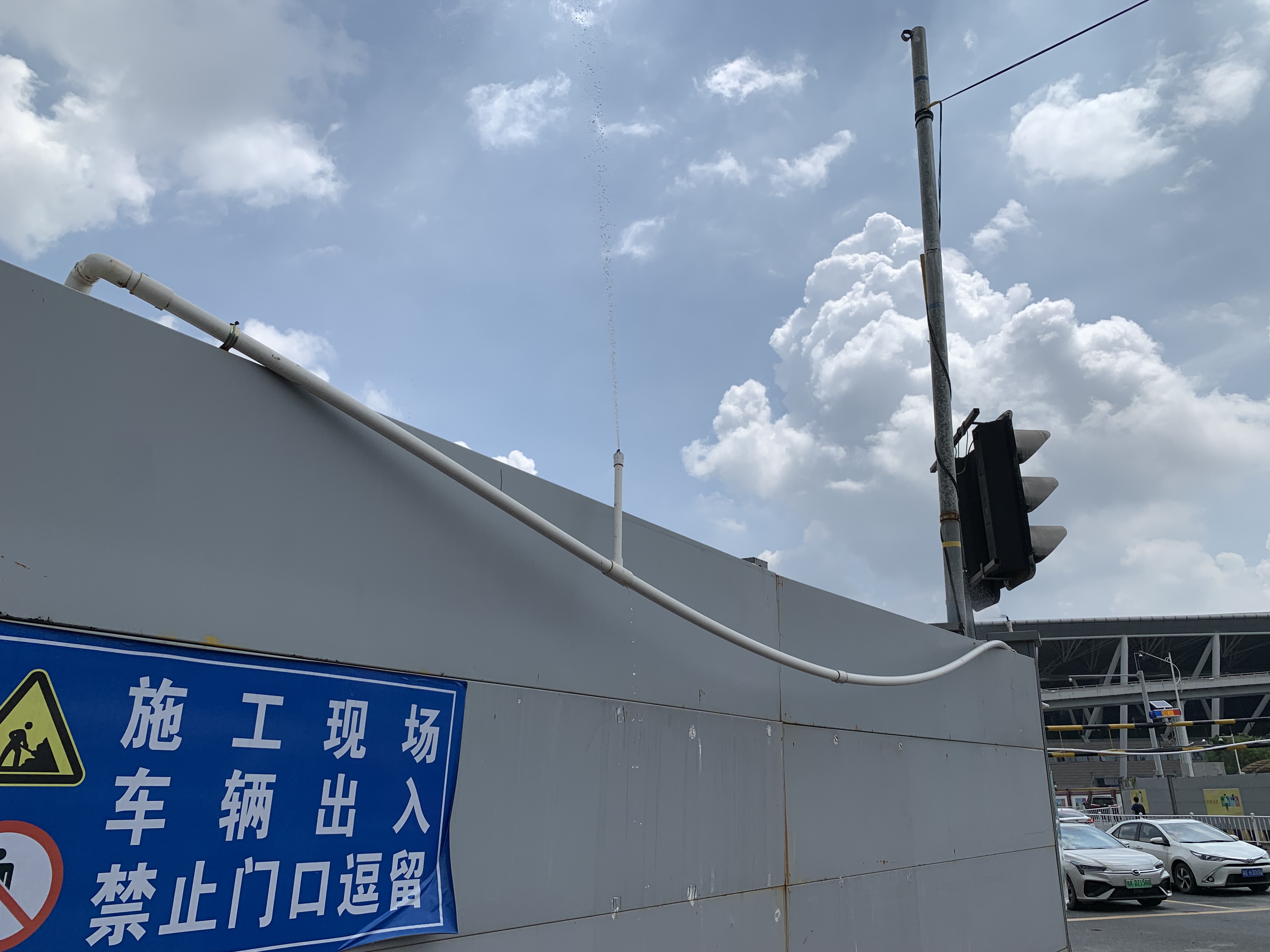 记者跟随执法人员来到南站周边某工地,只见工地大门紧密,里面传来机器的轰隆声和打桩声,施工正在进行。不过,执法人员留意到,工地的喷雾洒水降尘并没有开启,部分位置更是没有安装。