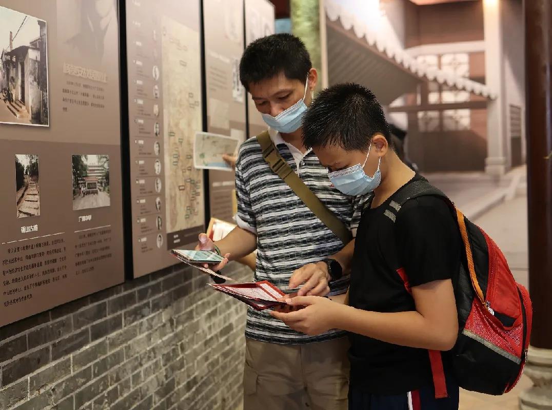 这次公益亲子研学第一站从杨匏安旧居陈列馆开始。在馆内,小朋友们有的独自开动脑筋仔细寻找答案,有的向家长求助共同讨论分析,有的则组成小队,围在一起分享和交流……他们借助馆内展板、展品的信息完成了相关线上问答。