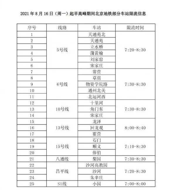 北京地铁公司消息,为进一步做好疫情防控工作,控制列车满载率,北京地铁公司将于2021年8月16日(周一)起对部分车站早高峰适时采取限流措施,通过站外限流的方式,减缓乘客进站速度,控制站台、列车拥挤程度,降低满载率,确保疫情期间乘客乘车安全。