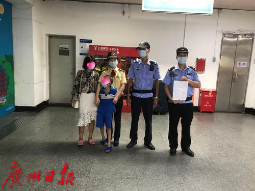8月5日18:20左右,广州地铁一号线芳村站值班员李海东在站台巡视时,发现一名没有佩戴口罩的小男孩在站台上奔跑,身边也没有家长陪同。李海东快步来到小男孩身边,弯下腰来尝试与小男孩沟通。可能出于对陌生人的害怕,小男孩不愿意告诉李海东任何信息。当广州东站方向列车进站开门时,小男孩试图冲上列车离开,却被机警的李海东拦了下来并将通知车站控制室。考虑到小男孩有可能与家人走失,父母必定会心急如焚。因为正值疫情防控期,李海东便先给他戴上口罩,同时呼叫辅警到现场协助。随后,辅警和值班站长王冰心赶到现场,留意到男孩手上戴着电子手表,于是大家便通过手表上的联系方式打给了妈妈。原来,小男孩下午与妈妈在芳村万象街里的超市购物,由于一时调皮被妈妈骂了几句,小男孩便趁妈妈不注意时赌气跑到了地铁站。李海东把小男孩领到车站的休息室,小心翼翼地帮他把粘乎乎的小手清洗干净。不久,接到通知的妈妈赶到车站。“妈妈,我在这里。”看到妈妈后,小男孩紧张的情绪立刻放松下来。“下次不可以再这样调皮了,吓死妈妈了!” 男孩妈妈热泪盈眶地接过小男孩。现场所有人一颗悬着的心终于落地了。“多亏有你们及时发现并阻止他自己坐车,万一走丢了我真不知道该如何是好。”妈妈激动不已地向李海东和辅警表示感谢。
