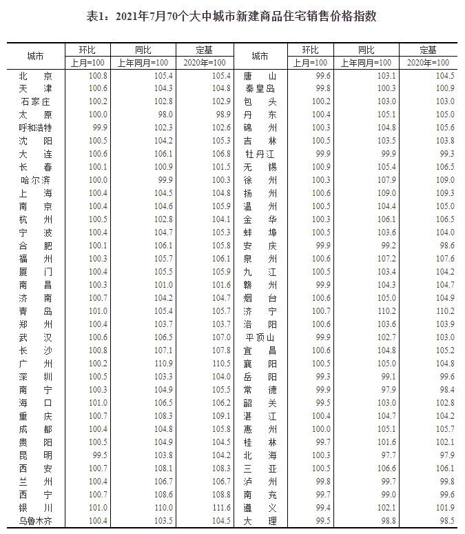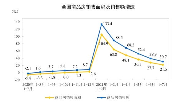 数据显示,1~7月份,全国房地产开发投资84895亿元,同比增长12.7%;比2019年1~7月份增长16.5%,两年平均增长8.0%。其中,住宅投资63980亿元,增长14.9%。1~7月份,商品房销售面积101648万平方米,同比增长21.5%;比2019年1~7月份增长14.5%,两年平均增长7.0%。其中,住宅销售面积增长22.7%,办公楼销售面积增长6.3%,商业营业用房销售面积增长3.8%。商品房销售额106430亿元,增长30.7%;比2019年1~7月份增长28.0%,两年平均增长13.1%。其中,住宅销售额增长33.1%,办公楼销售额增长9.1%,商业营业用房销售额增长5.0%。