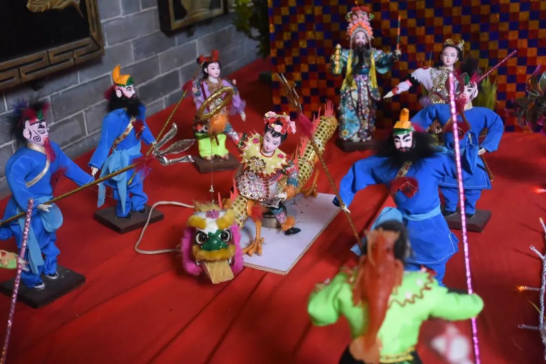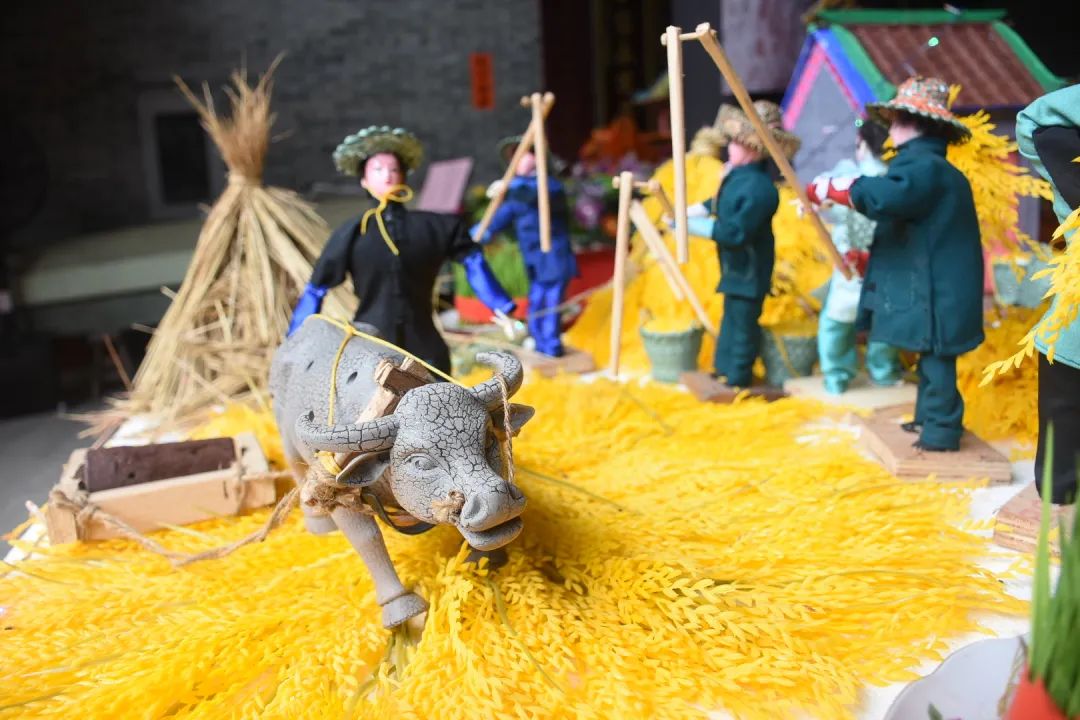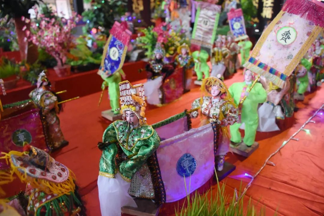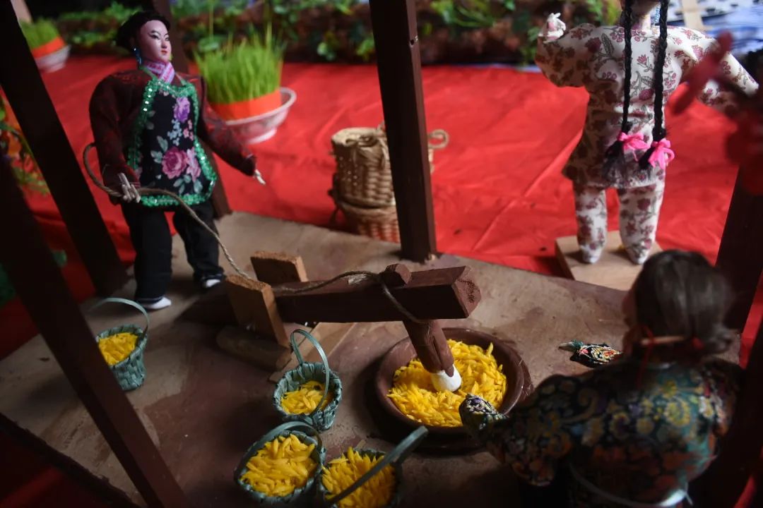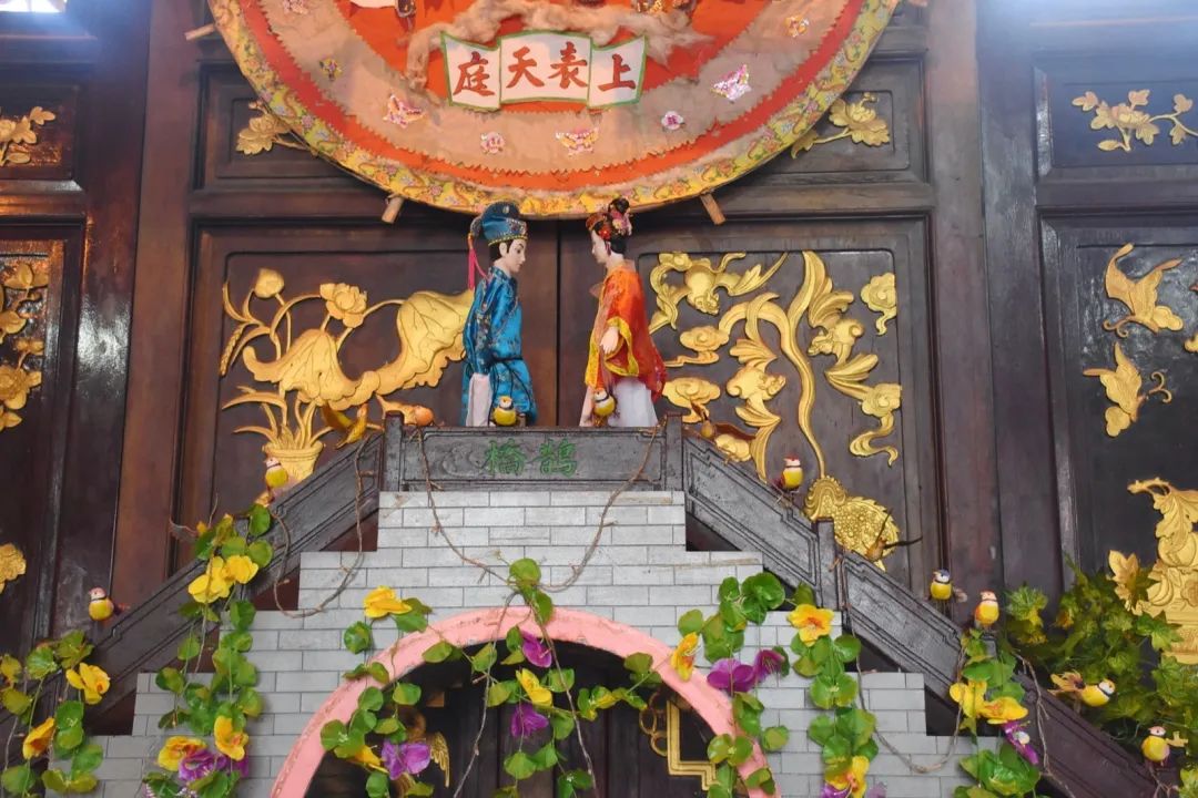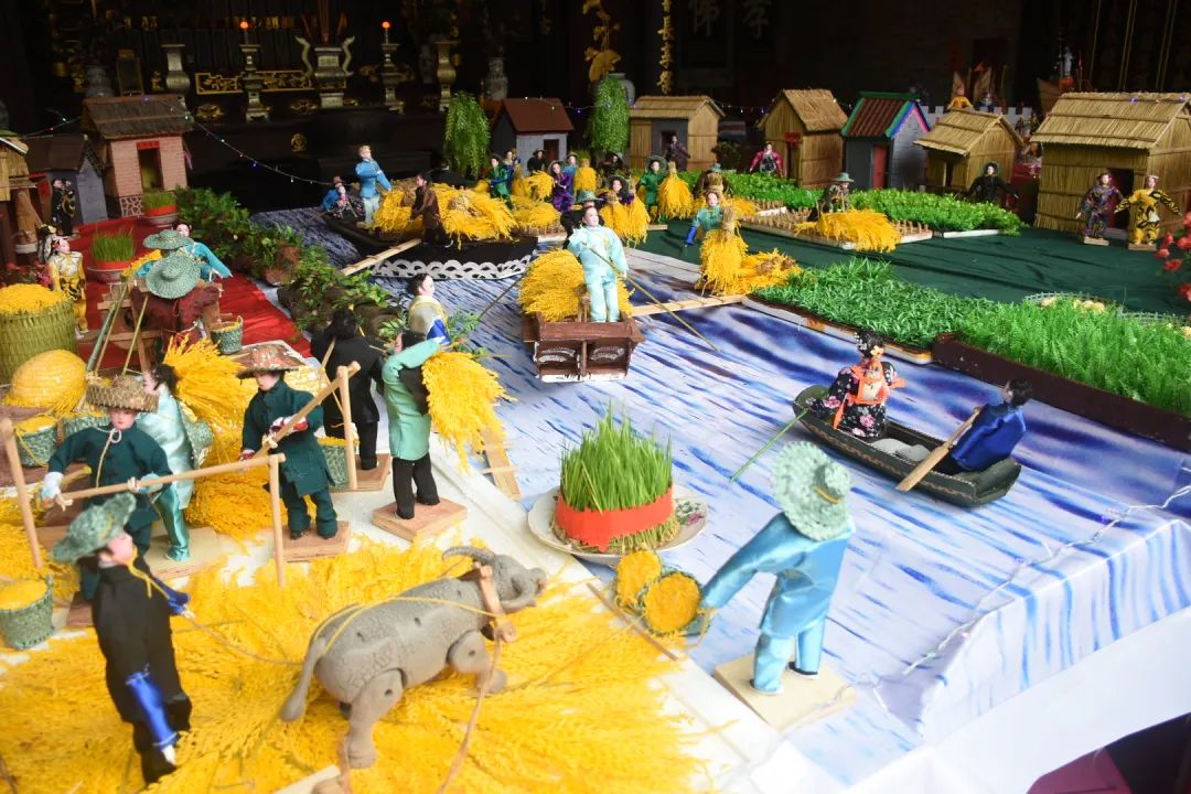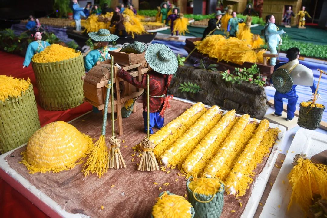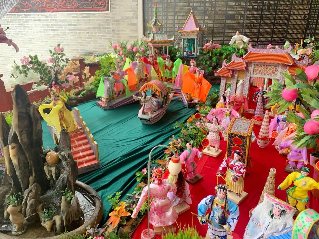 乞巧贡案《六国大封相》在之前展出过,但今年全部重新制作,作品比之前更加精致。50多个乞巧公仔两边排开,依序行进,场面很是壮观,每个公仔神态各异,极具观赏性。乞巧节是以“牛郎织女”的民间传说为载体的传统节日,每年必有相关故事的作品,也是现场最为经典的场景,今年也重新创作。