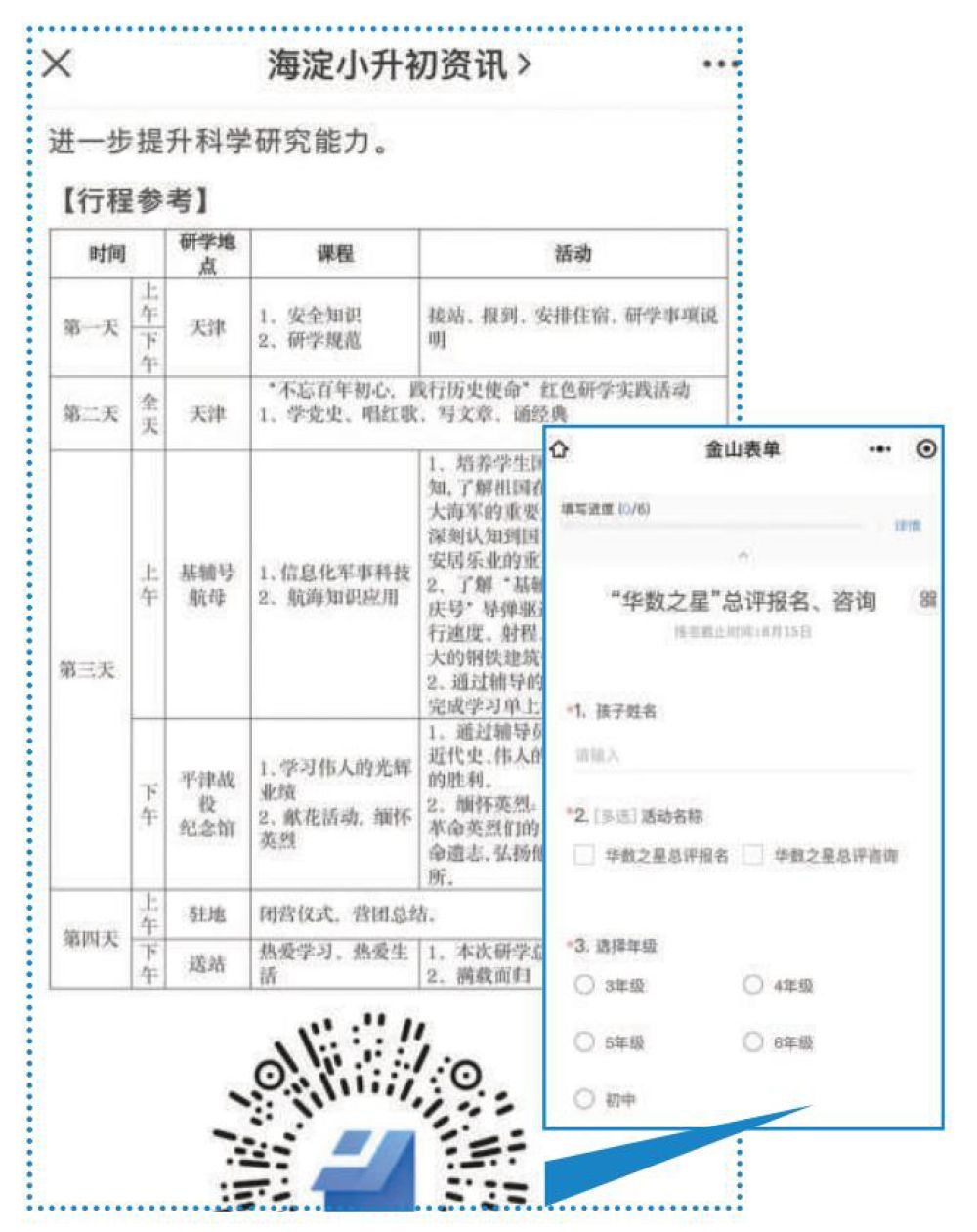但记者打开某家长分享的推荐页面却发现,手机扫完报名咨询二维码后,跳出的却是“‘华数之星’总评报名、咨询”的表单,要求填写孩子的姓名、年级等信息(见上图)。不少公众号在推荐这个研学营时,标题直接打出“你懂的,众所周知,这个研学营‘意义非凡’,名额有限,暑期错过无。”