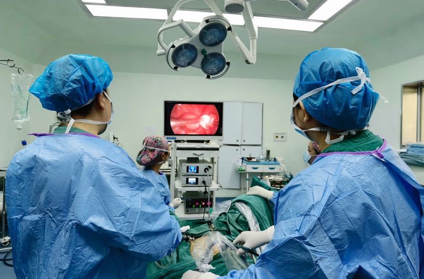 北大深圳医院生殖保存中心主任吴瑞芳(左一)、曾荔苹主任医师(右一)在腹腔镜下顺利获取患者的部分卵巢组织,并将这部分卵巢组织转入实验室冻存,为患者将来恢复生育功能保存了希望