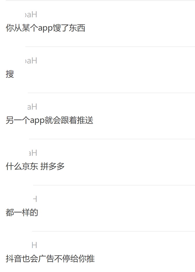 知乎、小红书资深用户小陈也遇到过类似的情况:今年3月,她在微信上告诉男朋友自己因备考焦虑而开始脱发,接下来的好几天,知乎总是推送不同品牌生发液的软文给她。“平时我的知乎里都是跟考公务员相关的回答,要不就是社会热点,我也从来没在知乎里搜过生发液,这接连几天的相关推荐让我感觉自己的一言一行被时刻监视着,这简直是楚门的世界,不寒而栗!”韦小姐也向记者反映:自己在小红书上搜索了某品牌的精华液之后,自己的京东、抖音和拼多多的首页上都出现了这个精华液的广告。“开始我还以为,是不是这个精华液真的卖得很火?后来才发现不是这样,是自己搜索的关键词被‘跟踪’了。”