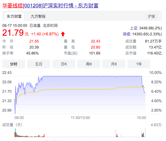 8月17日,在A股市场3800只个股下跌之际,华菱线缆大幅高开,盘中一度站上涨停板。截至收盘,华菱线缆上涨近7%,报21.79元/股,换手率达45.86%,市值116.5亿元。记者注意到,从6月24日上市至今,华菱线缆累计涨幅高达493.73%。