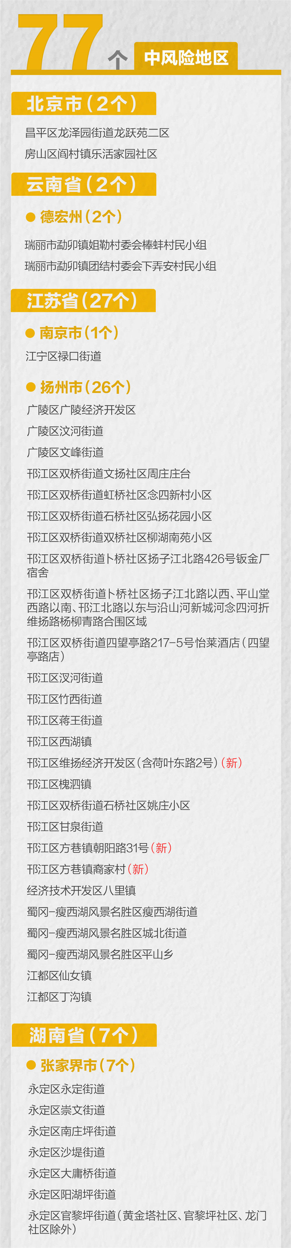 一、扬州市邗江区维扬经济开发区荷叶东路2号、邗江区方巷镇朝阳路31号、邗江区方巷镇裔家村调整为中风险地区。