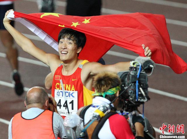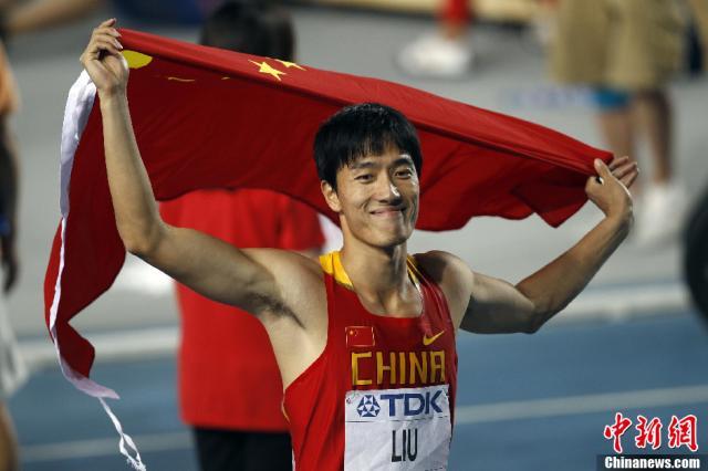资料图:2007年8月31日晚,刘翔在第十一届世界田径锦标赛男子一百一十米栏比赛中夺得金牌,实现世锦赛夺冠夙愿。中新社发 毛建军 摄