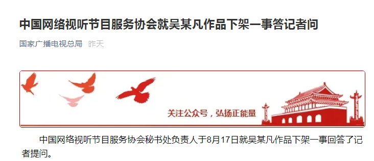 8月17日,中国网络视听节目服务协会秘书处负责人就吴某凡作品下架一事回答了记者提问,表示中国网络视听节目服务协会坚决支持会员单位采取的联合行动,支持下架吴某凡参演的影视综艺节目。