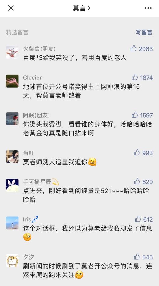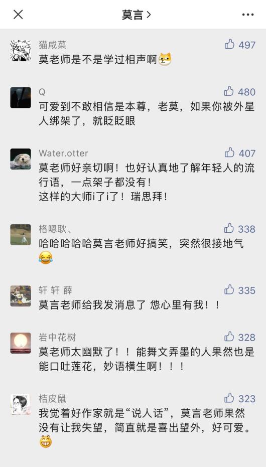 莫言的这番勇于踏破“次元壁”的言行也同样引起了读者的共鸣,在这条推文的底下精选留言第一位的网友评论道:“‘随着年龄的增长,世界变得多种多样’,作为年轻人,我们也希望和同莫言老师这样有独特经历和阅历的长者有所互动和交流,也非常期待老师以后的公众号文字!”