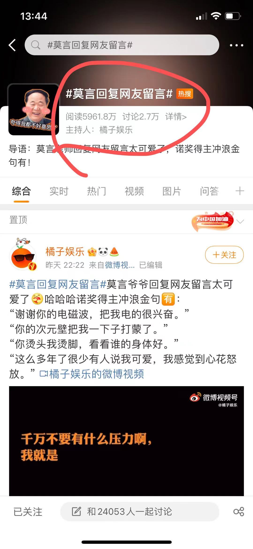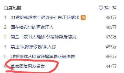 截至记者发稿前,#莫言回复网友评论#也上了微博热搜18名,阅读将近6000万,讨论人数2.7万,也登上了百度热搜排行榜第6名。