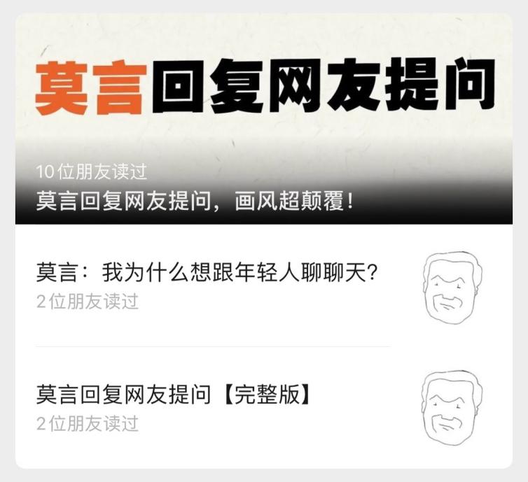 8月16日晚10点,莫言公众号准时发布了《莫言回复网友提问》《莫言:我为什么想跟年轻人聊聊天》以及《莫言回复网友提问(完整版)》三篇推文。