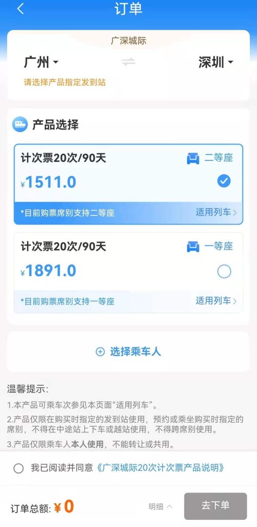 12306APP广深城际“20次计次票”购买页面。通讯员供图