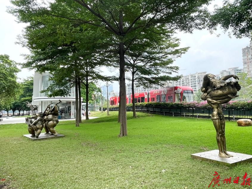 驿站外面两侧的草地上,还摆放了著名雕塑家许鸿飞五件代表作品,吸引了很多市民游客驻足。