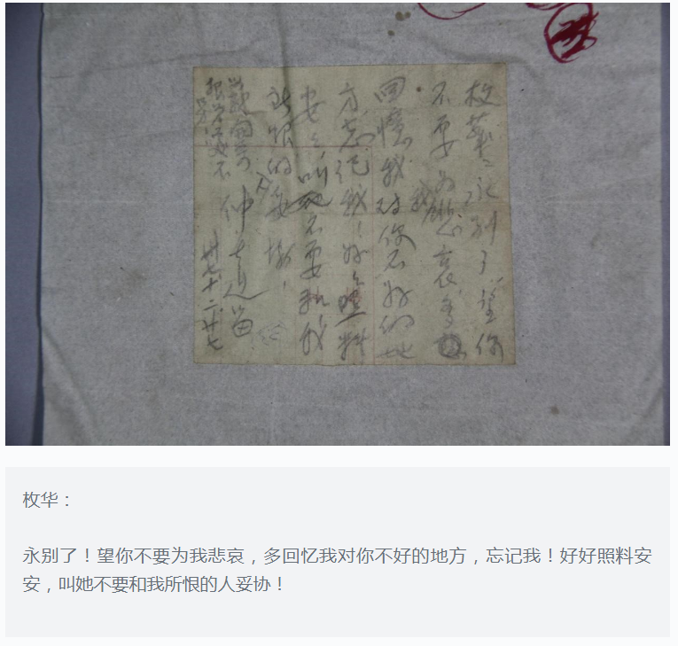 这是骆何民烈士1948年12月27日临刑前,在一张手纸上写给妻子费枚华的遗书。