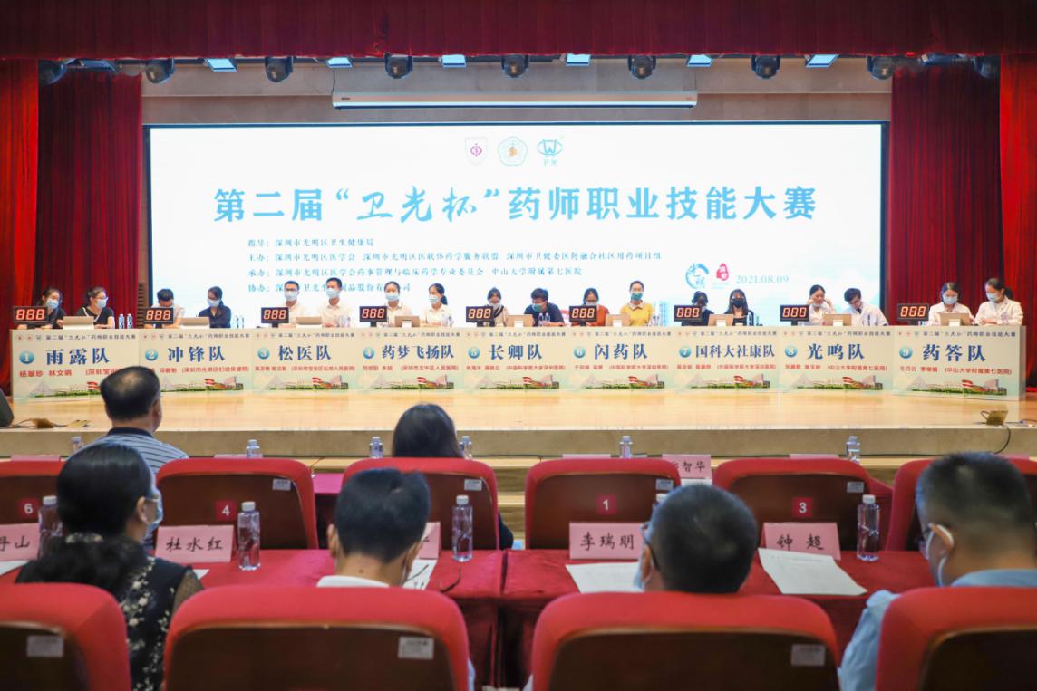 本次比赛邀请到了深圳市卫生健康委员会医院管理与药物政策处的刘新宇主任、深圳市药学会吴建龙秘书长、北京大学深圳医院药学部王立军主任担任大赛评委,中山大学附属第七医院郑智华副院长、光明区医学会胡建辉秘书长及大赛冠名企业—深圳市卫光生物制品股份有限公司张战董事长到场致辞,深圳市光明区医学会刘伟平会长全程指导。本次大赛还首次邀请了光明区外的两支队伍同台竞赛。光明区医学会药事管理与临床药学专业委员会主委、中山大学附属第七医院药学部主任周本杰教授主持开幕仪式。