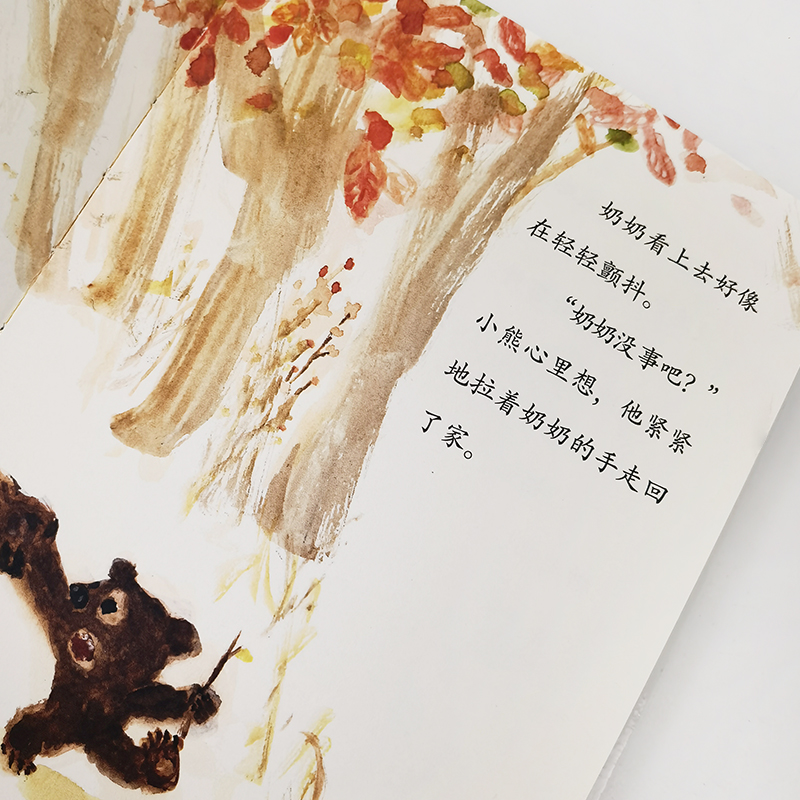 小熊非常高兴能和熊奶奶一起生活,可是有一天他发现昨天和熊奶奶一起做过的事情,今天熊奶奶就不记得了。小熊非常生气,他一个人跑到森林里去采橡子。在森林里,他发现熊奶奶一个人正呆呆地坐着,于是他走过去和奶奶说话。熊奶奶说完话后,就“咚咚”地敲打自己的胸口,她说这样做是为了记住和小熊在一起的每个美好时光……