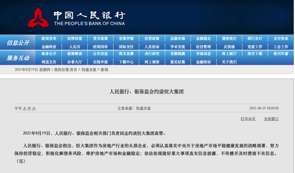 2021年8月19日,中国人民银行官网消息显示,人民银行、银保监会相关部门负责同志约谈恒大集团高管。