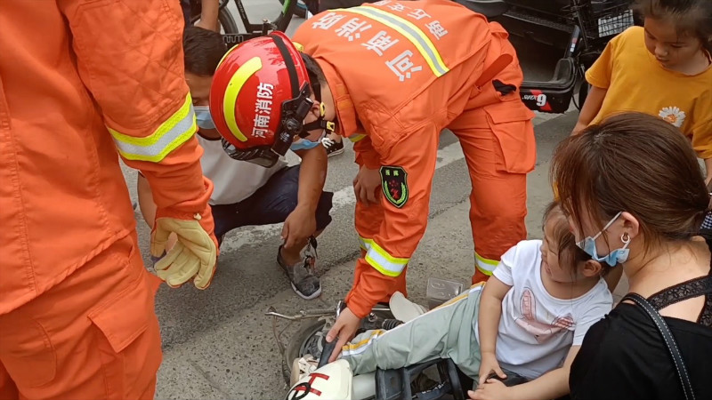 日前,河南商丘民权大队指挥中心接到群众报警称,位于民权县博爱路与北海路交叉口向北200米路西一名三岁女童脚卡电动车,急需救援。接警后,民权大队指挥中心立即调派民主路消防站前往现场实施救援。