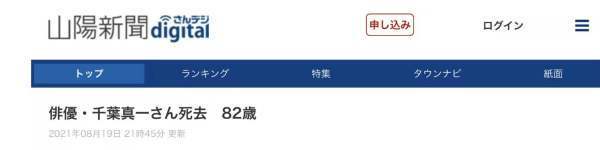 另据体育日本报道,千叶真一当地时间19日17时26分因新冠肺炎在千叶县君津市的医院去世。其所在事务所当天晚些时候公布了这个消息。报道提到,千叶真一所属事务所称,他是从8月8日起因新冠肺炎病情恶化而入院,一直持续吸氧。