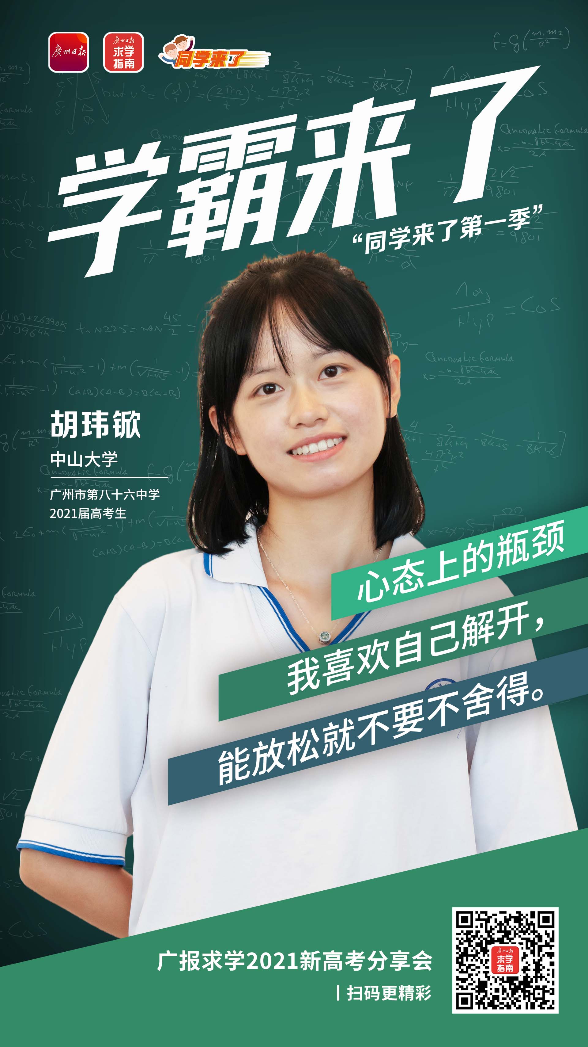 毕业于广州市第八十六中学的胡玮锨同学在今年高考中表现出色,被中山大学录取。得益于父母的严格要求,胡玮锨在小学时就养成了良好的学习习惯,这对她中学的学习很有帮助,“培养了认真、热情的学习态度,初高中阶段的学习基本靠自主,因为那个时候我已经知道自己学习是为了什么。”