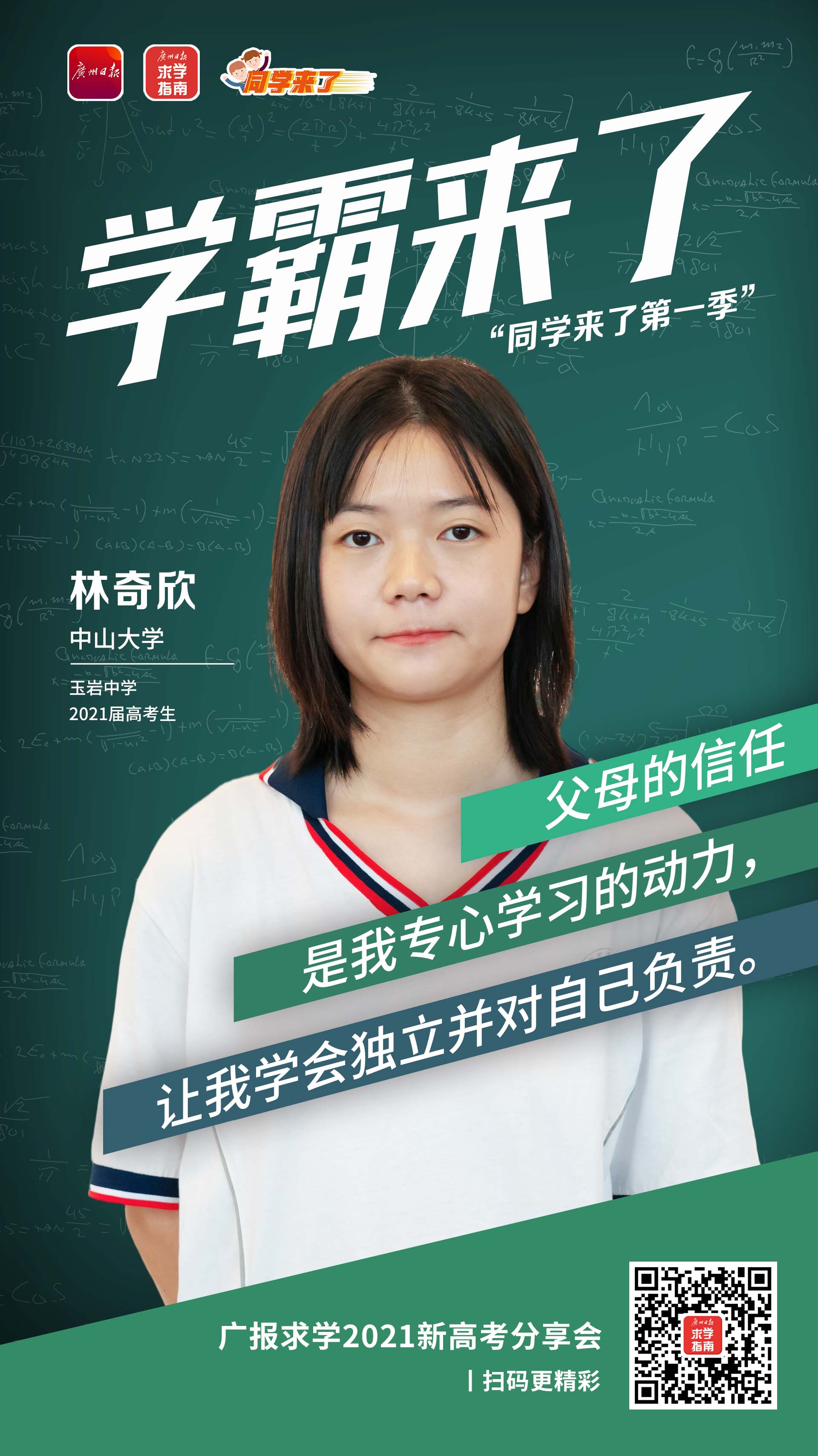 毕业于玉岩中学的林奇欣同学将前往中山大学求学。从小到大她在学习上主要靠自主,父母因为工作繁忙,并未过多监督她的学习。她表示,自己在“放养状态”下长大,她十分感激这样的成长经历。“父母不过多干涉我的学习,适时给予我鼓励,我很感谢他们把一些决定权交到我手上,让我学会独立并对自己的选择负责。这种信任是我专心学习的动力之一。”林奇欣说。