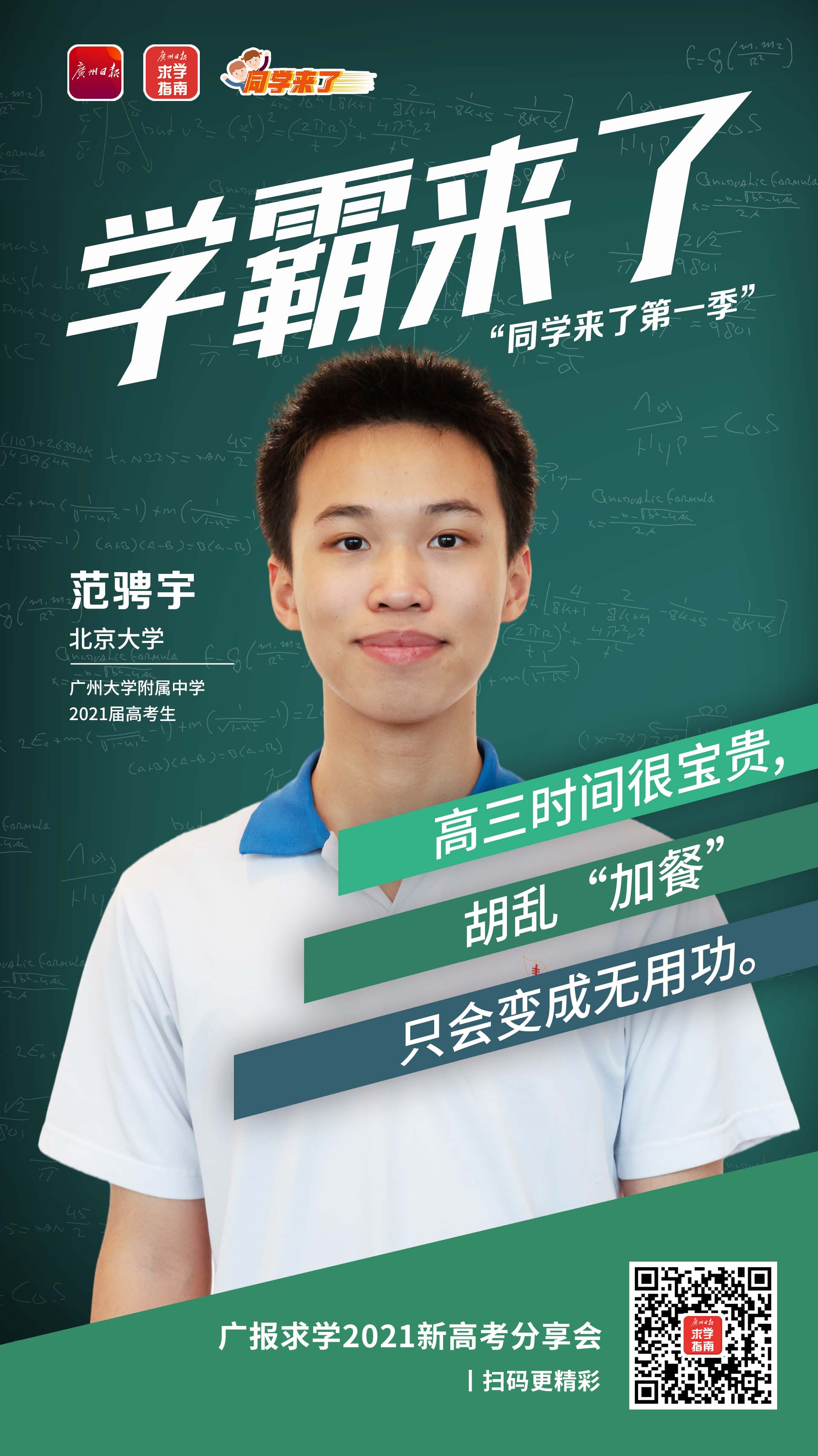 广大附中毕业生范骋宇已被北京大学录取。在他看来,家长应尊重孩子的特点,进行个性化培养;应该突破“给孩子安排学习是为孩子好”的思想藩篱,更重视对孩子的自律能力与自我认识能力的培养。