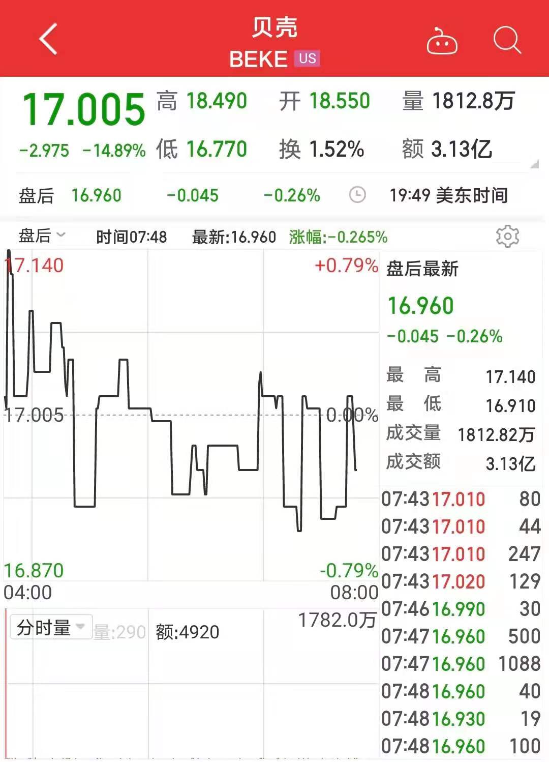 贝壳股价暴跌超14%