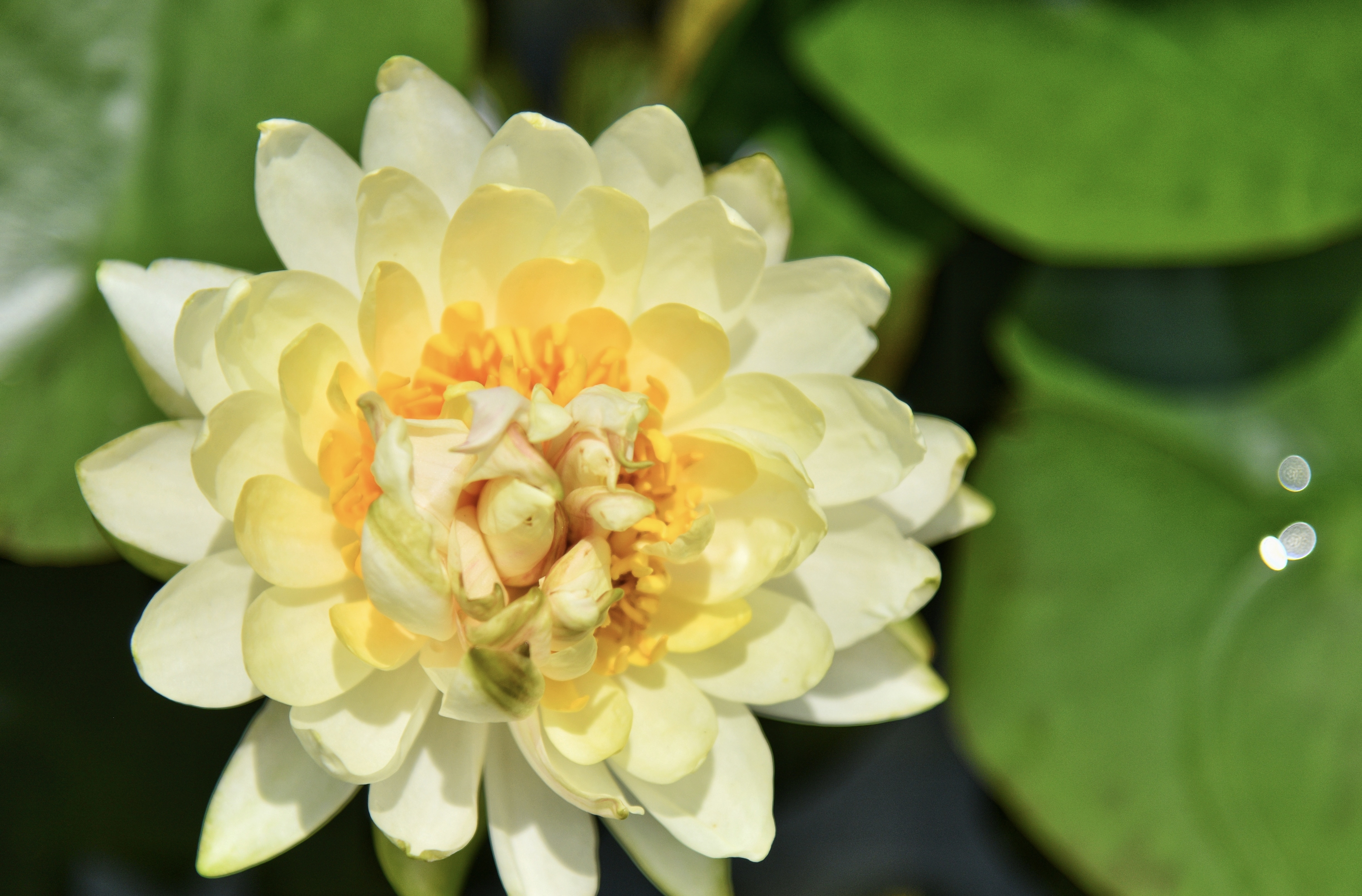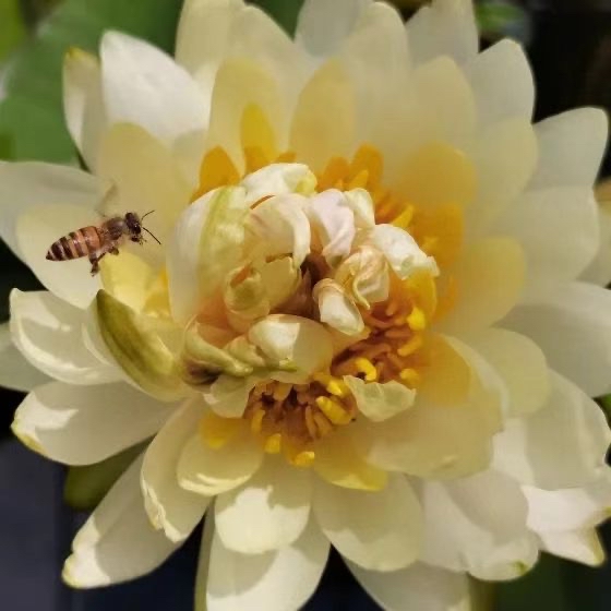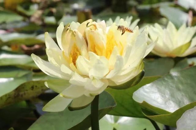 走进莲花山旅游区莲花育种基地,在夏日暖阳下,淡黄花瓣层层相叠,五个娇嫩花芯更是吸引了蜜蜂前来采蜜。