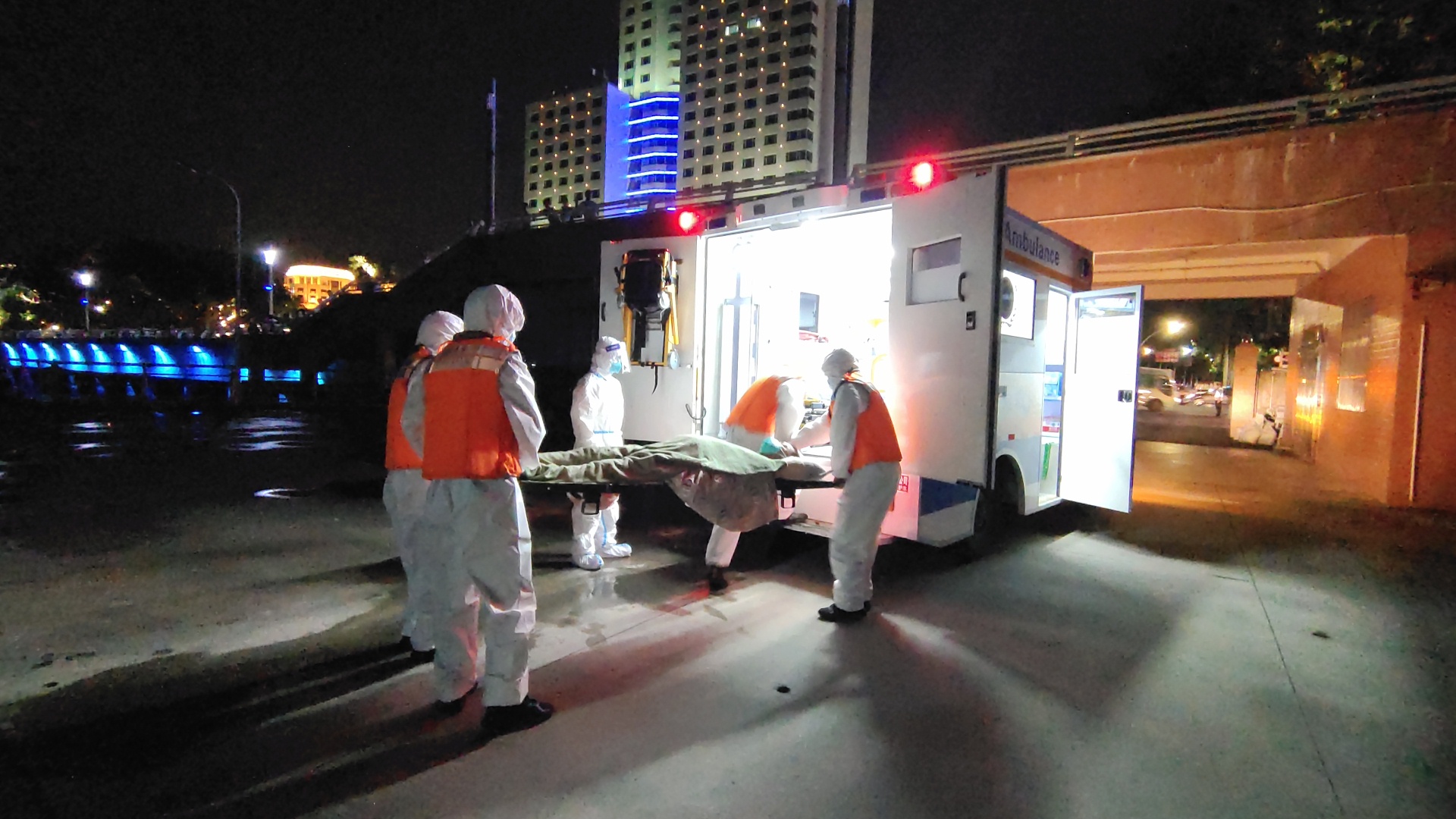 海警执法员确定事发船只后立即进行靠帮营救,先对受伤船民进行了体温测量,再利用担架对其进行固定并覆上毛毯,随后与该船船员一起将伤者转移至执法艇上。紧接着,执法艇全速驶回汕头海警码头,将伤者转移至早已在码头等候的120救护车上。