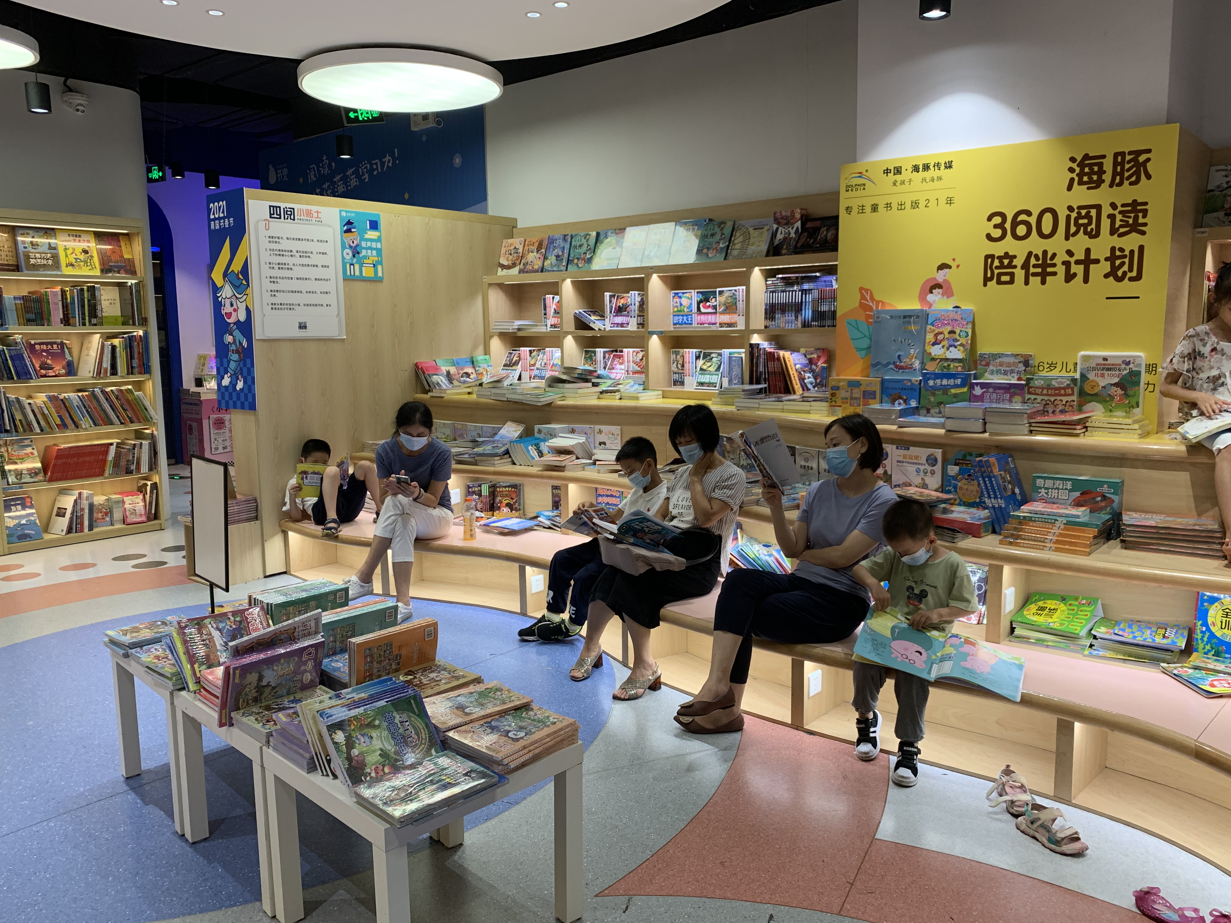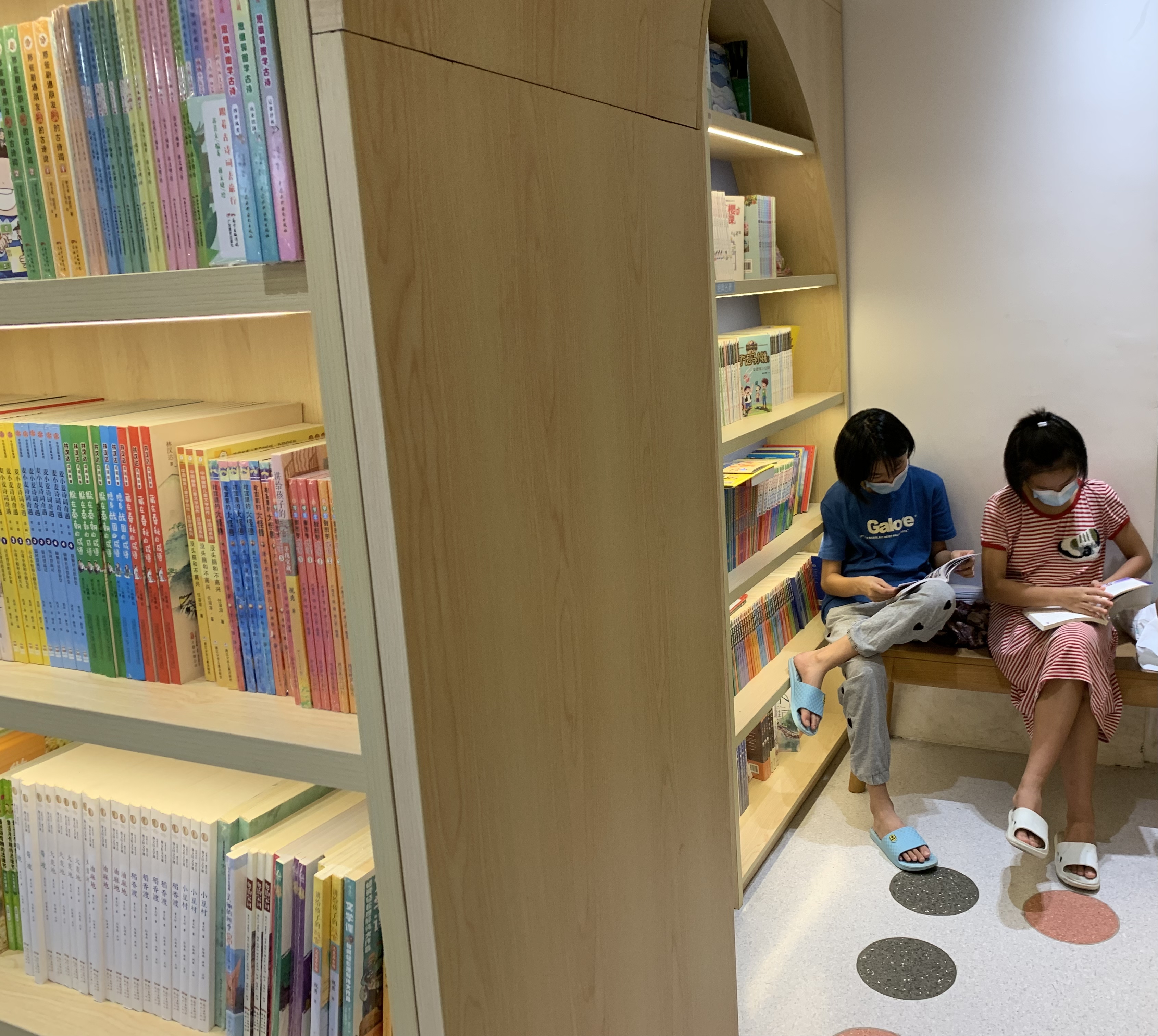 再往里走,映入眼帘的是富有童趣的设计,这里是亲子阅读区。白天,不少老人家带着孙子孙女到这里,边玩边学,相比起其他区域,这里相对吵闹。好在书店够大,这个空间完全独立,倒也影响不了其他区域读书的“大朋友”。到了晚上,陪孩子们前来的自然是下了班的年轻父母,他们或许是饭后陪着孩子散步到此,然后就开始一起阅读。孩子们看得全神贯注,家长们也在旁边阅读,或读自己喜欢的书,或是亲子阅读,整个区域比起白天的“玩乐区”反而安静了许多。抑或,这就是润物无声的言传身教吧!