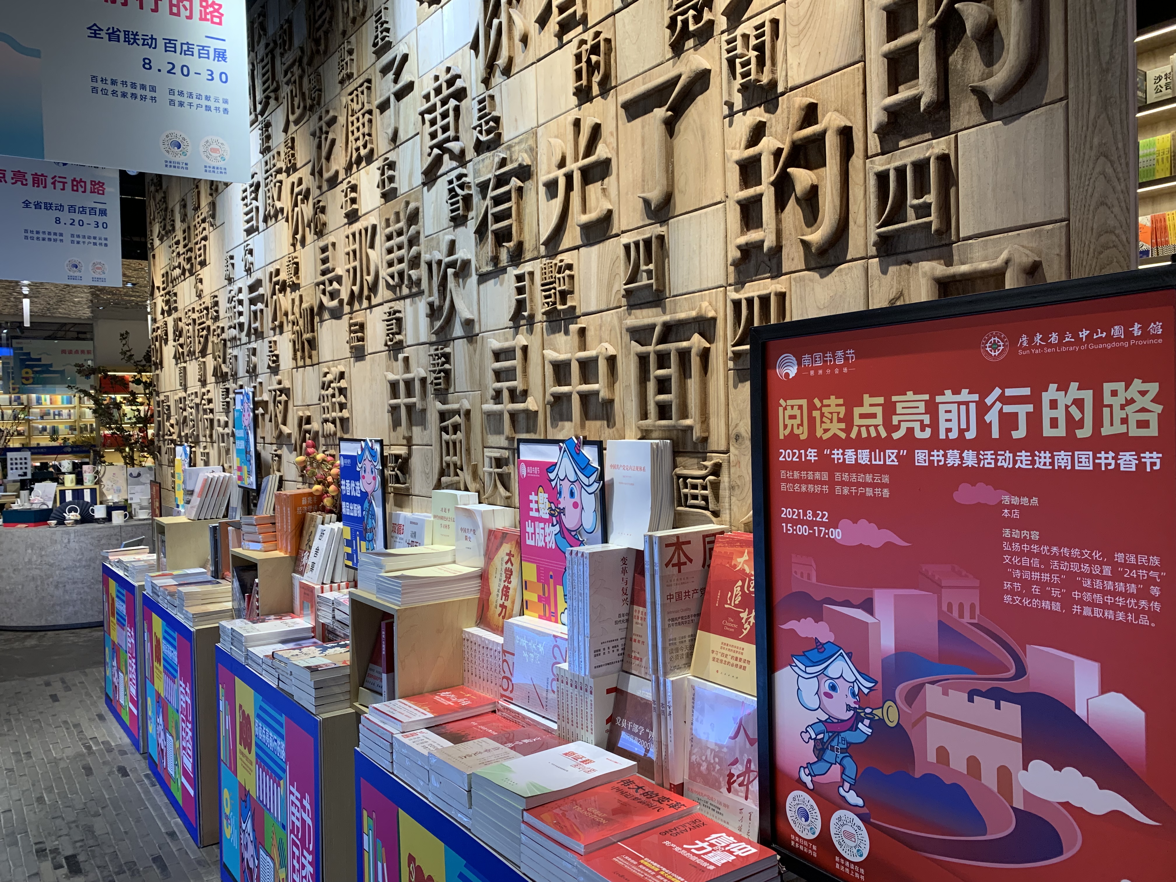 一进门,一盆显眼的翠绿植物映入眼帘,下面摆放的全是最新出版的书,绿意盎然,书香满溢。对面一整面的“文字墙”古色古香,下面还辟出专区,这是“南国书香节”组委会特别为读者推荐的主题书单,“红色主题出版物”、“书香优选”、“粤版精品出版推荐书单”、“中国出版集团出版物推荐书单”,众多题材各异、值得一看的新书、好书一目了然。