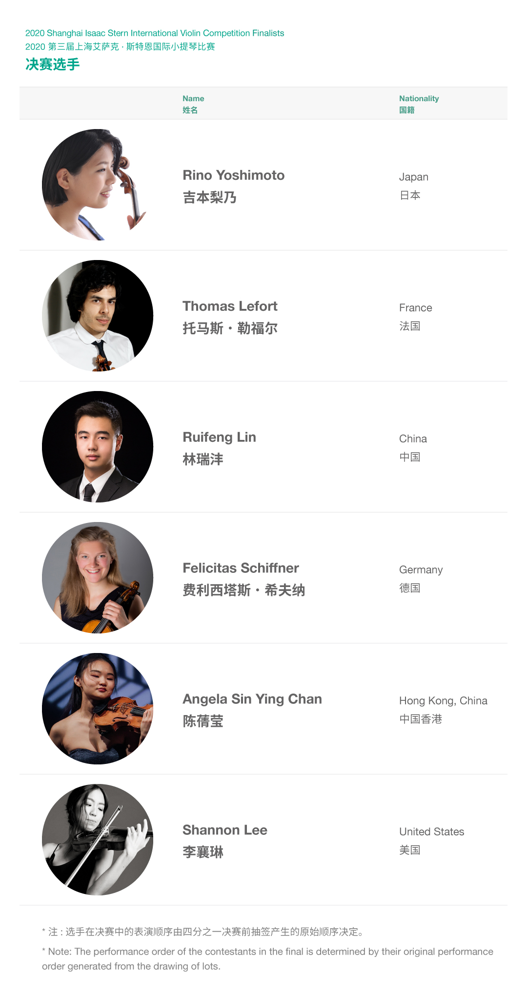 2021年8月22日,第三届上海艾萨克·斯特恩国际小提琴比赛线上赛段闭幕,经过8天激烈的线上角逐,6名选手脱颖而出晋级决赛,他们分别是吉本梨乃(日本)、托马斯·勒福尔(法国)、林瑞沣(中国)、费利西塔斯·希夫纳(德国)、陈蒨莹(中国香港)以及李襄琳(美国)。他们将有机会于明年来到上海,进行线下的巅峰对决。