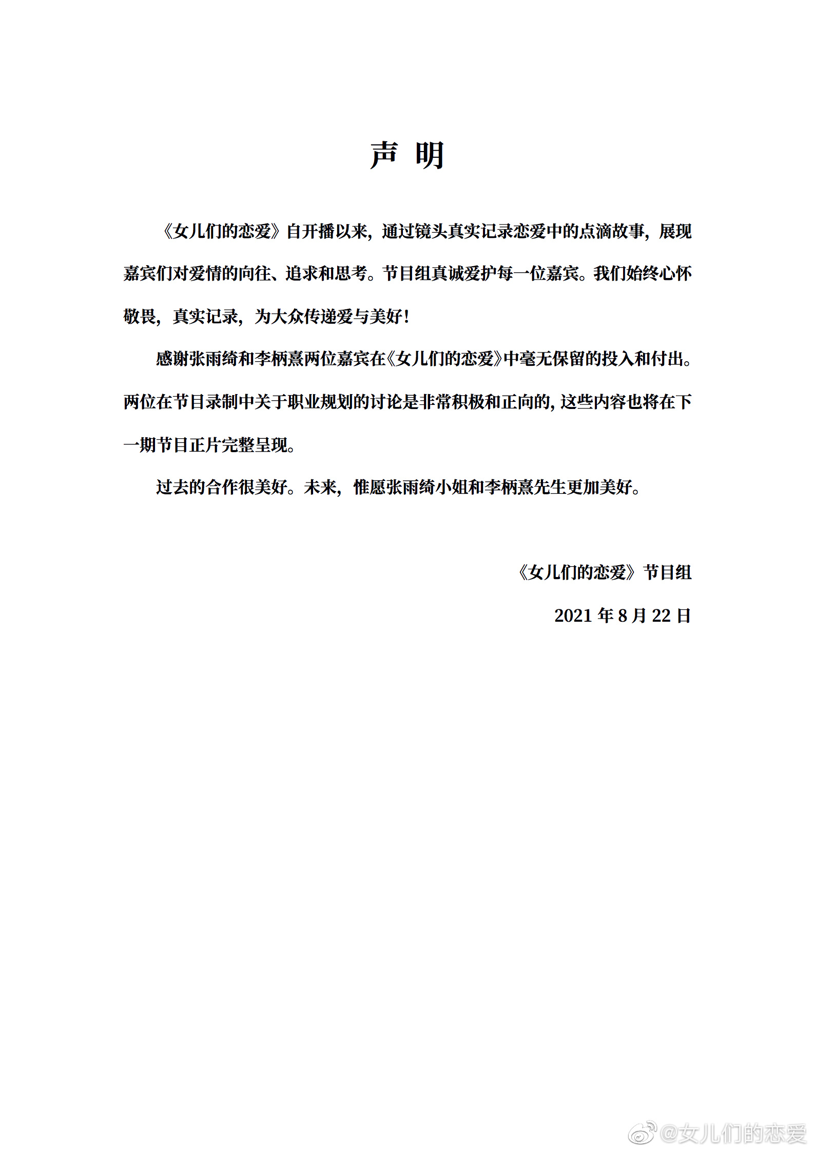 8月22日深夜,《女儿们的恋爱》节目组发声明,回应张雨绮李柄熹将退出节目后续录制一事。声明写道:“感谢张雨绮和李柄熹在节目中毫无保留的投入和付出。两位在节目录制中关于职业规划的讨论是非常积极和正向的,这些内容也将在下一期节目正片完整呈现。”声明里强调,节目“通过镜头真实记录恋爱中的点滴故事,展现嘉宾们对爱情的向往、追求和思考”,节目组“真诚爱护每一位嘉宾”“为大众传递爱与美好”。