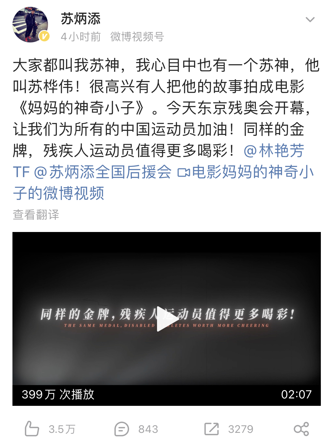 8月24日,苏炳添更新微博,称“自己心中也有一个苏神,他叫苏桦伟!很高兴有人把他的故事拍成电影《妈妈的神奇小子》。”他还为中国残奥健儿送上祝福:“今天东京残奥会开幕,让我们为所有的中国运动员加油!同样的金牌,残疾人运动员值得更多喝彩!”