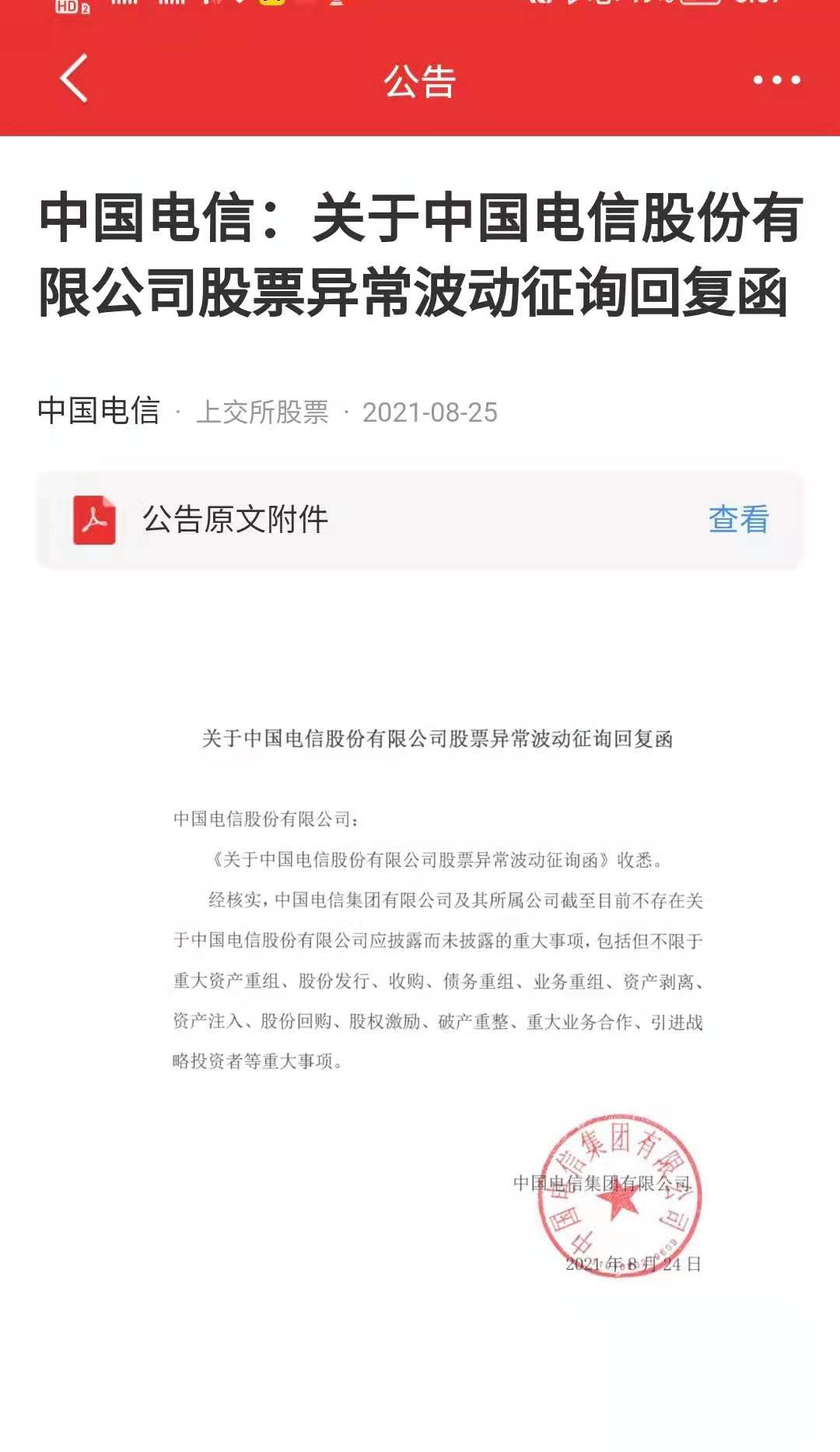 24日下午,中国电信发布了《关于中国电信股份有限公司股票异常波动征询回复函》。中国电信表示,经核实,中国电信集团有限公司及其所属公司截至目前不存在关于中国电信股份有限公司应披露而未披露的重大事项,包括但不限于重大资产重组、股份发行、收购、债务重组、业务重组、资产剥离、资产注入、股份回购、股权激励、破产重整、重大业务合作、引进战略投资者等重大事项。