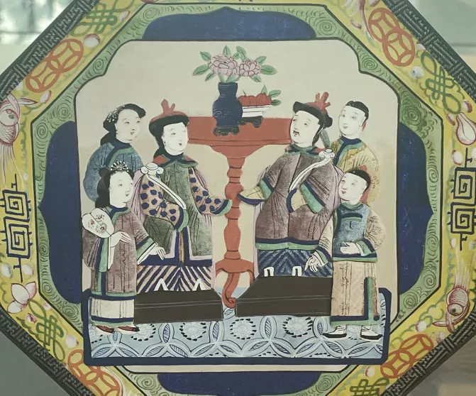 ▲绢面八角形纨扇(仿制品)清道光中期(约1830-1840年前后)该八角形纨扇为绢面,木扇柄髹黑漆。扇面一面以浮凸手法绣“满大人”及其家人共六人。人脸为象牙片,衣服贴丝绢,庭园和边饰为彩绘。以黑漆描金框封边;另一面绘庭园人物图案,合共三十人活动在其间,身着便服,多人手上执折扇或团扇。