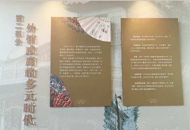 外销扇承载了18-19世纪中西文化贸易的交汇,让旅客感受清代时期广州当时市场流行的品位和潮流变化的内涵。有清代康熙、雍正及乾隆中期以前的象牙扇,乾隆中期开始用的玳瑁、黑漆描金、银、贝壳作扇面或扇骨,发展到嘉庆以后出现了纸质扇面、丝质扇面、檀香木扇面等。