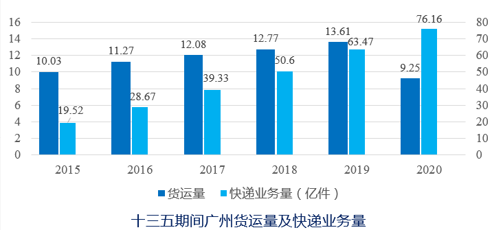 近年来,广州综合交通枢纽功能全面增强,现代物流产业规模稳步增长,物流中心地位持续提高。据统计,2020年,全市完成社会货运量9.25亿吨、快递业务量76.16亿件,货邮发展保持全国前列;白云国际机场货邮吞吐量175.95万吨,位居全国第2;广州港集装箱吞吐量达2351万标箱、货物吞吐量6.36亿吨,分别位居全球第5、第4位。