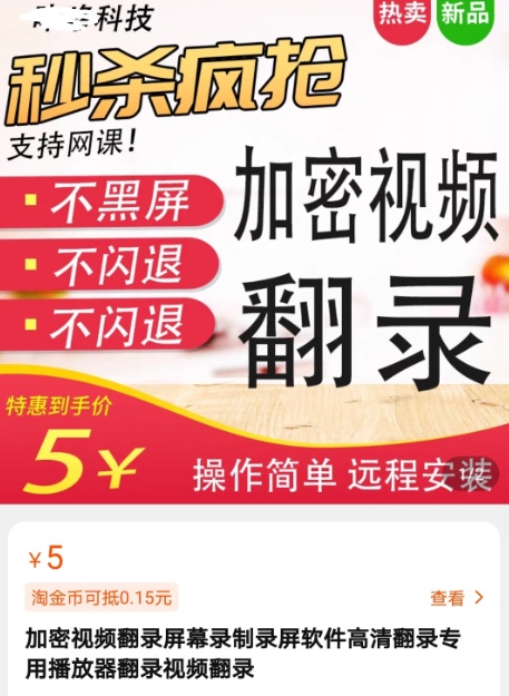 “只要是电脑屏幕上放的,我们都能翻录。”一家网店售卖的视频分割截取软件只卖10元,销售人员告诉记者,这个软件不仅可以翻录,还能去马赛克、剪掉视频的头尾等“无效信息”,即便是加密视频,依然能够破解,只不过价格会提高一些,“你提前把加密视频的播放器图标告诉我,我们再报价。我们有专门的技术客服跟你对接,保证翻录效果,无效退款。”记者咨询了五六家网店销售,说法都大同小异,价格也近似,其中两家网店的月销量都已经破百,其余几家的月销量也在两位数。