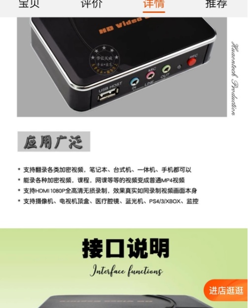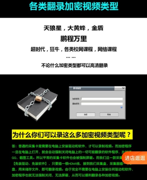 这种软件购买之后,技术客服会远程指导买家安装。还有一种购买后可以直接使用的翻录机,也是最近热销的爆款。这款机器的卖家在介绍产品时,也把不需要在电脑上安装驱动或者软件,不会被加密程序强制关闭作为主要卖点,从而宣称“校网课程、网络课程……什么加密类型都可以高清翻录”。