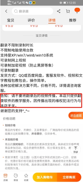 在促销这些产品的同时,各家网店还都给出了“只提供翻录软件教学服务”“产品只供家庭使用”等解释,从而声明“因传播出现的维权犯法行为与本店无关”,试图逃避责任。但这些产品的存在,确实在客观上刺激了盗版视频的增加,一旦出现问题,其实也难逃侵权责任。