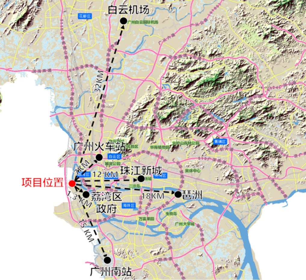 滘口汽车站地块位于荔湾区西部,距离白云机场 32公里,距离广州火车站 7公里,距离广州南站15公里,距离荔湾区政府1.3公里,北至芳村大道西,南至真光中英文小学,西至芳盈路、瑞安花园,东至1号线滘口地铁站,交通区位优越。根据现行控规,滘口汽车站地块用地性质为公路用地、商业金融业用地、供应设施用地、公园绿地和水域;周边地块以商业金融业用地、村集体经济发展地、军事用地、二类居住用地为主。滘口汽车站权属面积约为12公顷,滘口汽车站地块涉及规划管理单元面积为139.6公顷。
