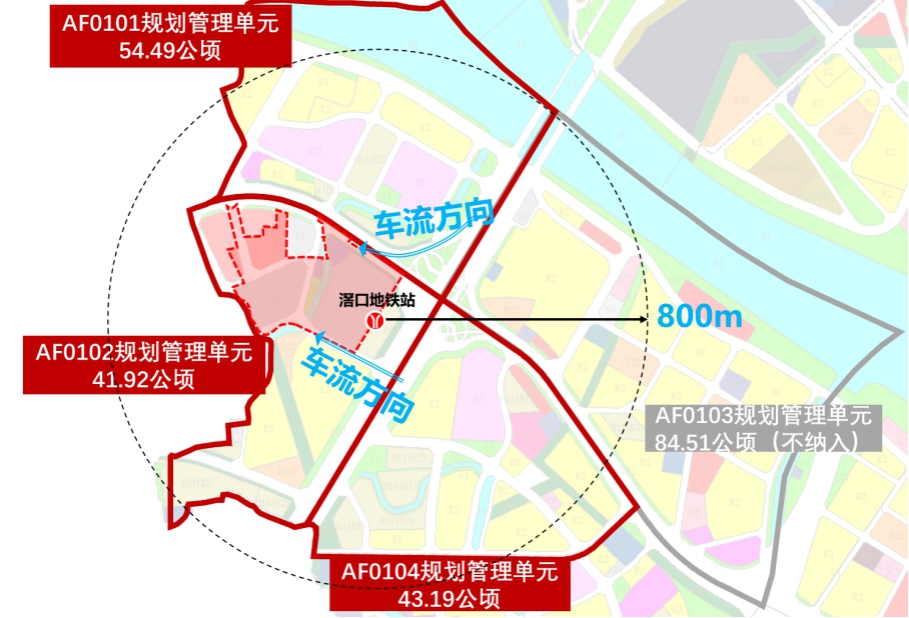 招标公告同时要求,从综合开发角度考虑,由于场地与滘口地铁站紧密联系,作为区域公共交通综合枢纽升级改造,应从交通综合一体化角度考虑用地实施规划控制。轨道交通站点半径800米范围内涉及的规划管理单元共4个。场地的主要车行、人行交通流线来自于北侧以及东侧,应着重考虑与北侧东侧规划管理单元的综合开发联系。
