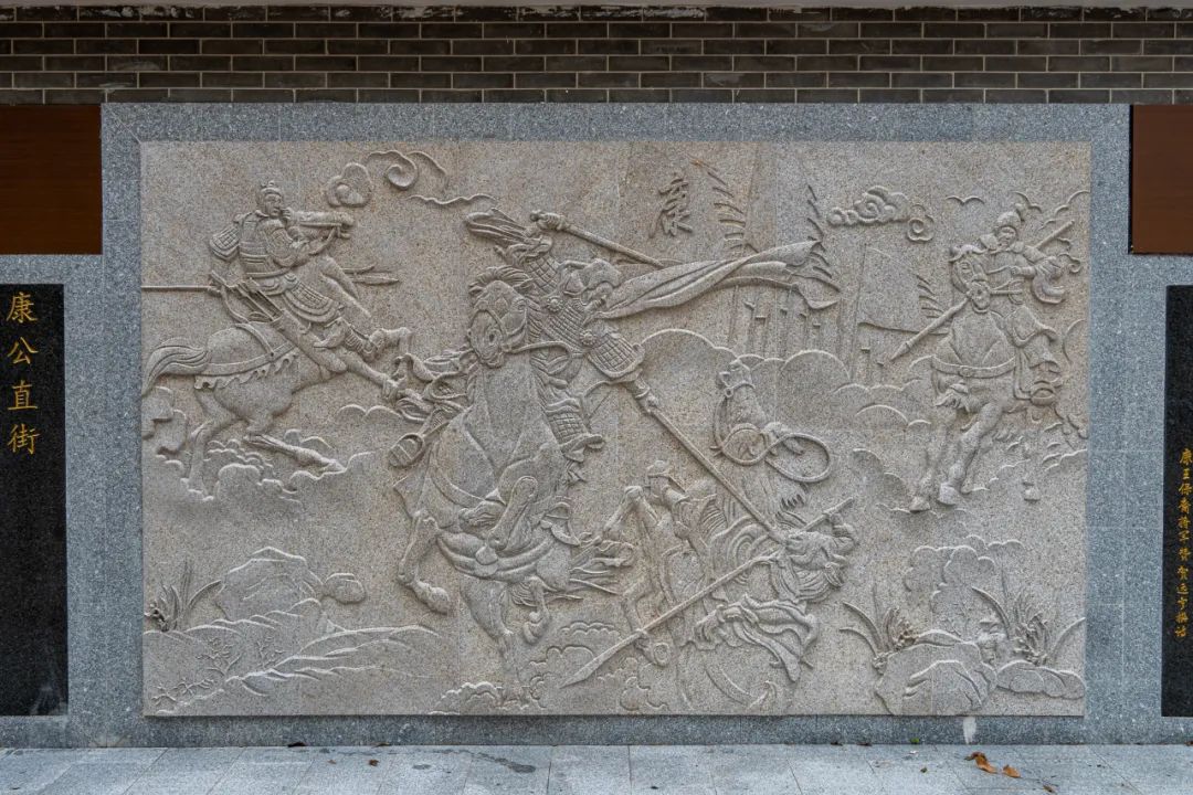 康公主题的邻里花园位于康王路与西华路交界,在康王地下城15号出口处,是浮雕墙+传说+诗词的组合。浮雕墙所展示的康王正在战场上奋勇杀敌,他披战甲、跨战马、挥刀枪,威风凛凛。(了解更多康王的故事,请戳☞荔湾城记 | 他从未来过,却一直守护岭南)
