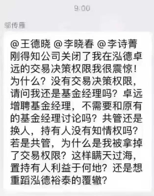 记者注意到,此次的回应源于,8月30日晚间,流传出来的一则署名为邬传雁的微信聊天截图,该微信聊天截图上显示,泓德基金基金经理邬传雁连发七问质问管理层:“刚得知公司关闭了我在泓德卓远的交易决策权限我很震惊!为什么?没有交易决策权限请问我还是基金经理吗?卓远增聘基金经理,不需要和原有的基金经理讨论吗?共管还是换人,持有人没有知情权吗?若是共管,为什么是我被拿掉了交易权限?这样瞒天过海置持有人利益于何地?还是想重蹈泓德裕泰的覆辙?”
